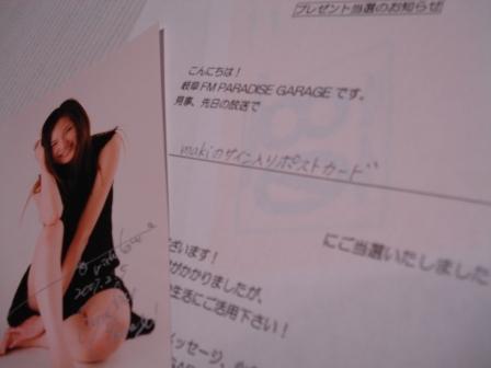 いや、今日帰ったらね。怪しげな封筒が。地元のラジオ局から。 何かと思って開封したら(開けるなよ)、なんと…… パーソナリティさんのサイン入りポストカードが。 サイトを確認したらばっちり名前載ってたよ(笑) 正直言って、偶然やっていた番組になんとなーく送っただけで、何も狙ってなかったんだけどね…。途中までしか聴いてなかったし。 その日のテーマは「彼氏・彼女(番組)に突っ込みたい事」。私は「声にエフェクトをかける時はちゃんとBGM消して下さいよ~」的ななんともムカつくメールを送りました。そんなんでも当たるんだ…。 なんか今から運をすり減らして来年の受験大失敗するヨ・カ・ン★ 取り敢えず汚れないように誰かラミネート加工してー…(なんて奴だ) P.S.番組タイトルはパラダイス・ガレージ。月火曜日担当のmakiさんからでした。